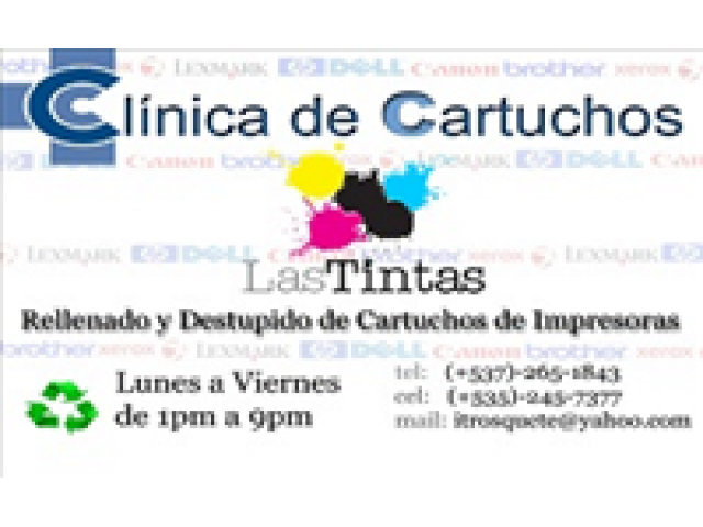 Llamar al 265-1843 Iván. Servicio de Lunes a Viernes de 1pm - 9pm. Clínica de Cartuchos ¨Las Tintas¨. calidad y seriedad 100% Se trabaja con equipos PROFESIONALES, destinados al tratamiento con cartuchos de tinta. La limpieza, calidad, seriedad y atención es EXTREMA; siempre pensando en su satisfación que es el principal objetivo. NO se realiza el trabajo a domicilio por razones de profesionalidad e inmovilidad con las máquinas destinadas al tratamiento de cartuchos. (trabajo en mi casa). Si su cartucho no queda bien, no lo tiene que pagar.